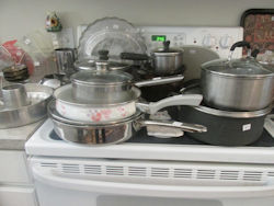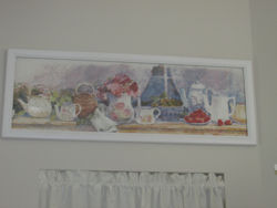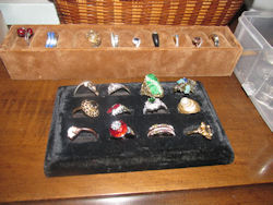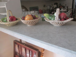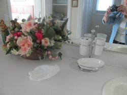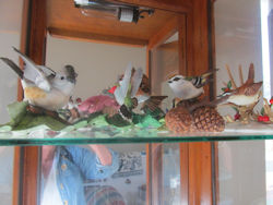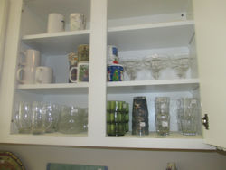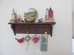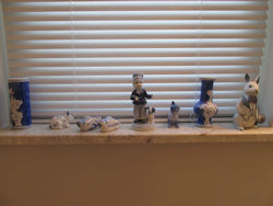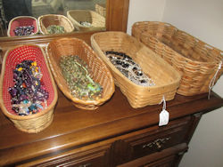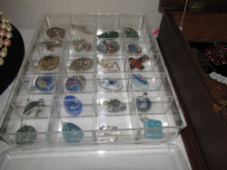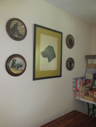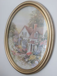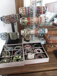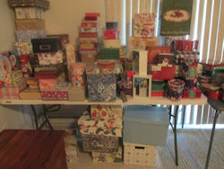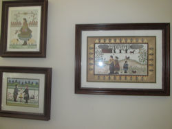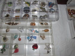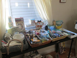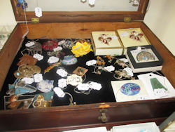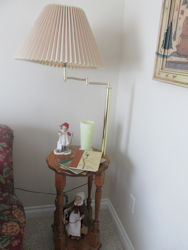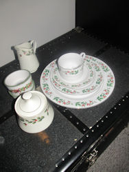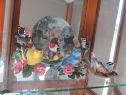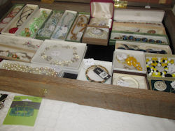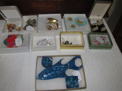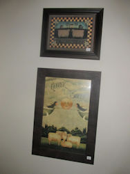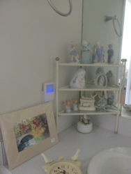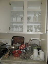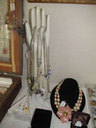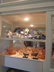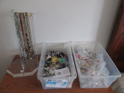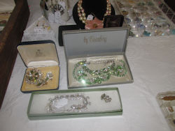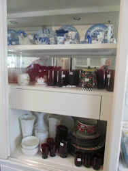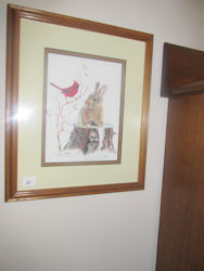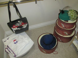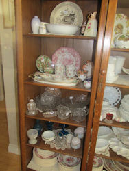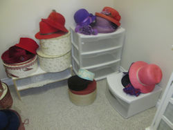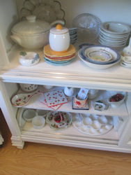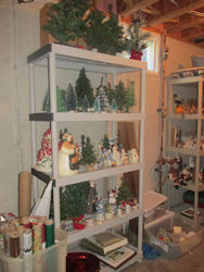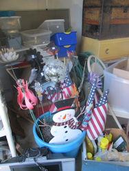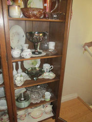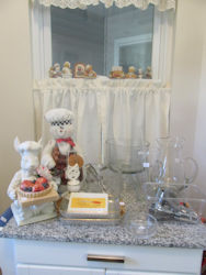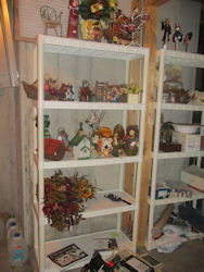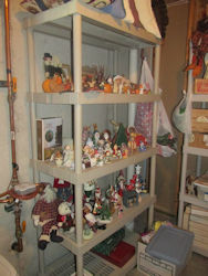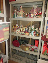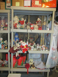 ACCESSORIES: Table/floor lamps, stack of braided rugs/scatter rugs, quartz clocks, small wall shelves, set Johnson Bros. dinnerware, small set Spode Christmas china, porcelain/china/pottery collectibles, cherry theme dishes, figurines/worldwide souvenir items, Lenox birds, crystal stems, miscellaneous glass-pink depression/red goblets/carnival/milk glass, silver plate flatware, collector plates, books, walls of whimsical framed Moss style prints featuring peasants/farm animals/birds, bedding/1930s tied quilts/linen tablecloths/throws, doilies, huge table of new terry bath towels & linen kitchen towels, Red Hat Society collectibles, many hat boxes/decorated storage boxes, throw pillows, purses, stuffed toys and doll figures, luggage, hundreds and hundreds of costume jewelry pieces, kitchen items galore including small appliances(many new), apartment size refrigerator, workshop area-work bench/drill press/wall full of tools, two large rooms in lower level filled with shelves and totes of holiday decorations floor to ceiling including large collection of Santas/wreaths/signs/craft items etc.