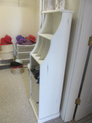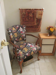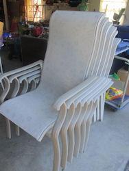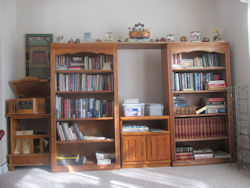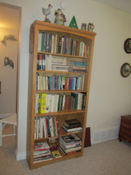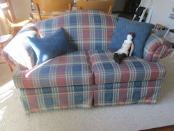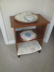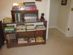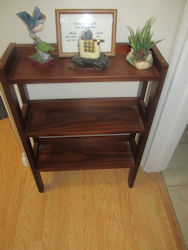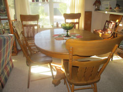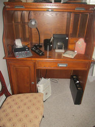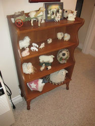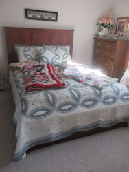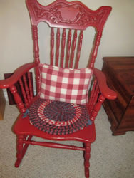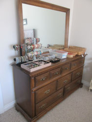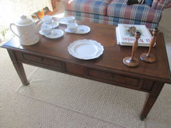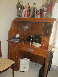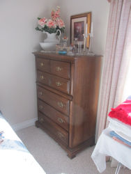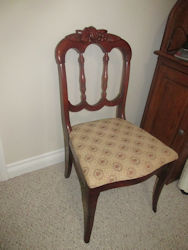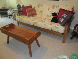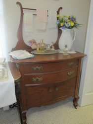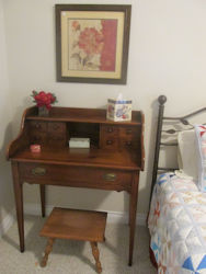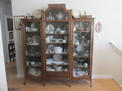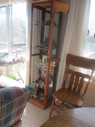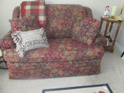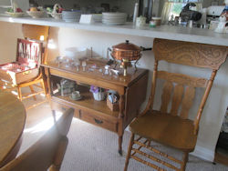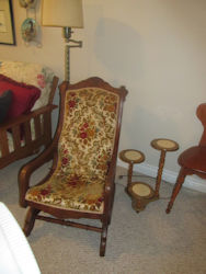 FURNITURE: Upholstered living room furniture-wine and blue plaid love seat/pair dusty rose swivel rocking chairs/Chippendale style arm chair, fruitwood coffee table/inlay top, antique oak dining room table/three (3) leaves/six (6) pressed back chairs/three (3) section glass doored china cabinet, 1960s maple drop leaf serving cart, wine floral print loveseat size sleep sofa, pair painted rattan side chairs, painted end tables, painted pressed back rocker, white wicker desk chair, bookcases, futon, vintage pine coffee table, pine ladies desk, vintage drop leaf dinette table/chairs,miscellaneous antique side chairs, oak queen size platform base bed, fruitwood dresser with mirror/marching tall chest, upholstered rocker, vintage end table/magazine rack base, two white painted bathroom cupboards, maple double bed, twin bed/metal headboard, two Victorian dressers/washstands/platform rocker/children's rocker/parlor chair, new oak computer rolltop desk, white painted rolling kitchen cart/faux marble top and large lighted wooden glass door pantry cupboard, mirrored back display cabinet, sewing machine cabinet(no machine), cedar chest, mirrors, wooden coat rack.